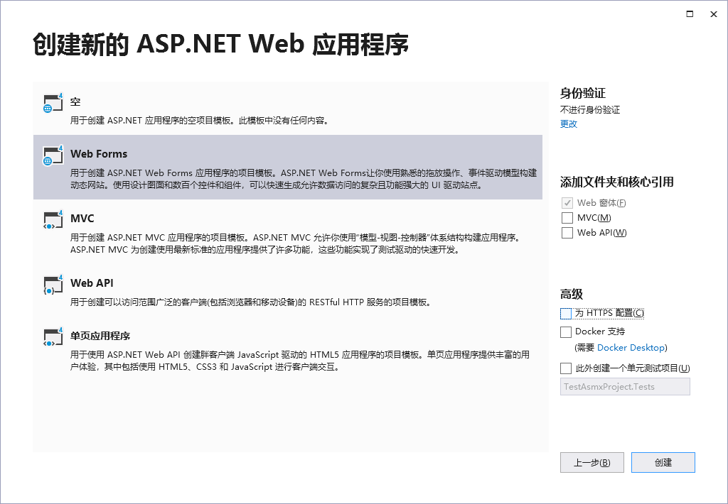 选择 Web Forms,取消右侧 为 HTTPS 配置 的选项。