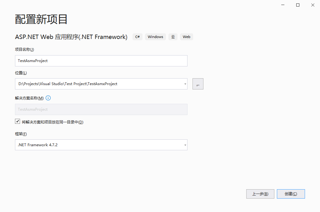 项目名称起名为 TestAsmxProject,框架选择 .NET Framework 4.7.2。