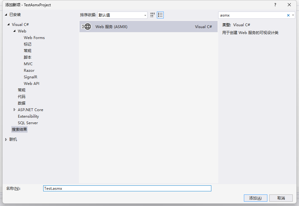 添加新项 中选择 Web 服务 (ASMX),命名为 Test.asmx。
