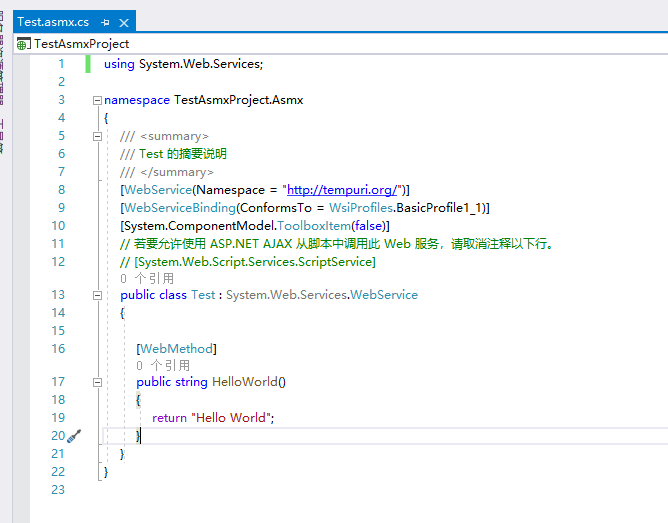 双击打开新建好的 Test.asmx,里面存在一个默认的 HelloWorld 方法。