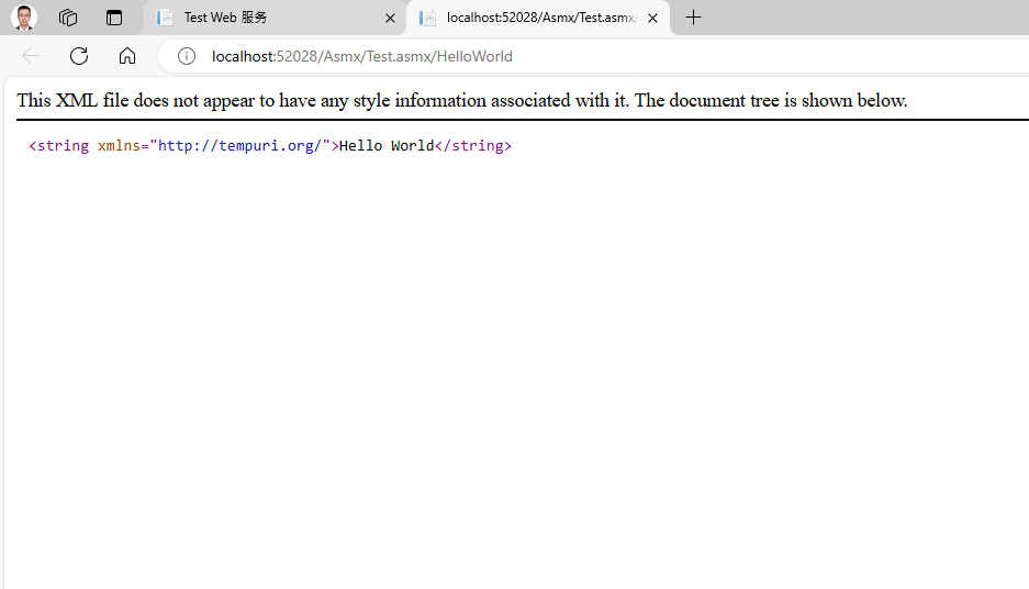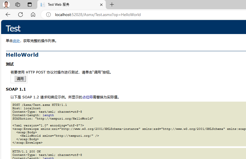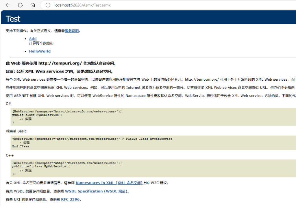程序启动后,浏览器输入 http://localhost:52028/Asmx/Test.asmx,页面如下: