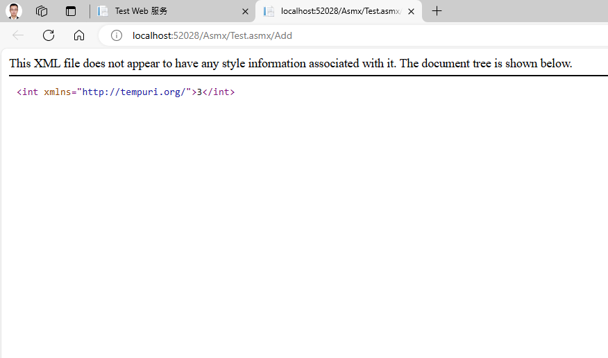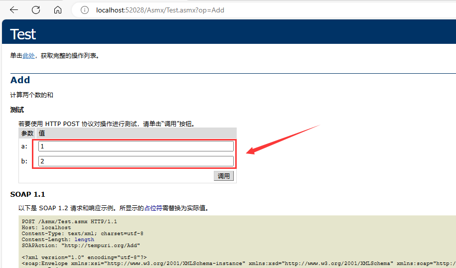 - 输入 Web 服务的 URL,例如:http://localhost:52028/Asmx/Test.asmx/Add;