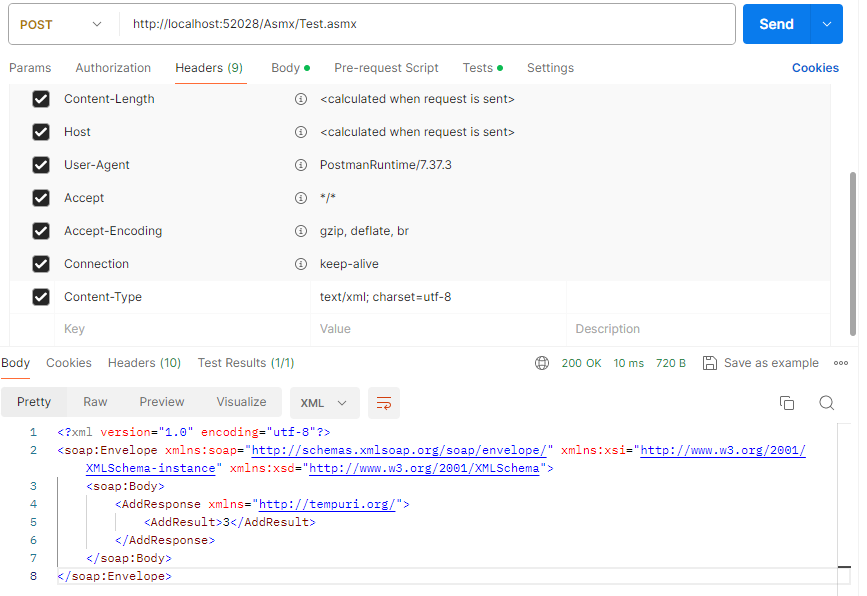SOAP 是一种基于 XML 的协议,用于在网络上交换结构化信息。通过 SOAP 请求,可以调用 Web 服务的公开方法。我们使用 SOAP协议 调用 Add 方法: