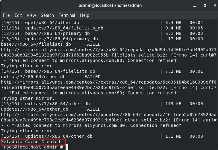 该错误发生在我们去清除并重新生成yum缓存的时候。在下载包时显示”Failed connect to mirrors.aliyuncs.com:80; Connection refused” 错误,导致下载失败,影响到我们yum的正常安装和后续使用。