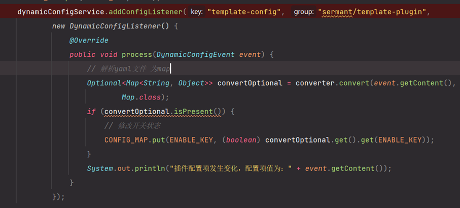 其实质是创建了配置监听器,实现了配置处理的process方法,其中DynamicConfigEvent就是监听到的配置更改的事件,包含了配置的group,key,content等配置信息。实现动态配置的相关实现是调用了自己实现的process方法,基于map对配置进行存储和处理,从而实现配置切换。