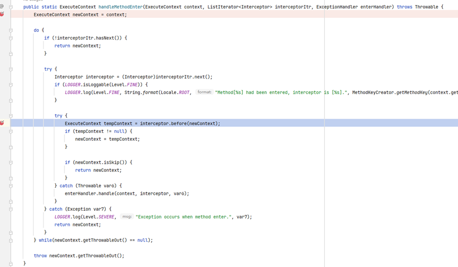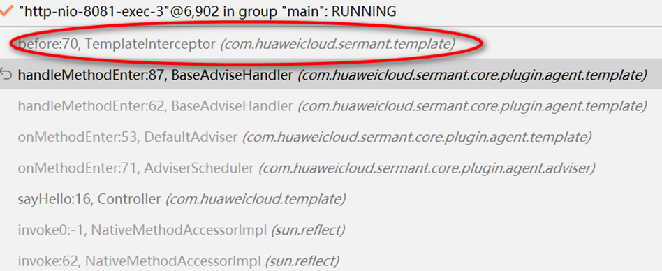 完成拦截进入到业务方法中,实现拦截功能的织入。然后进入后置拦截,完成after的拦截逻辑。