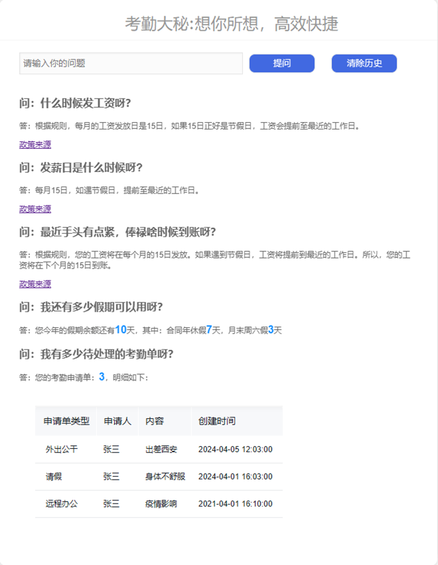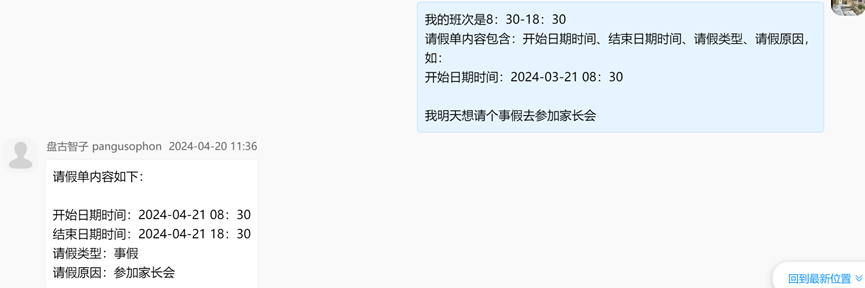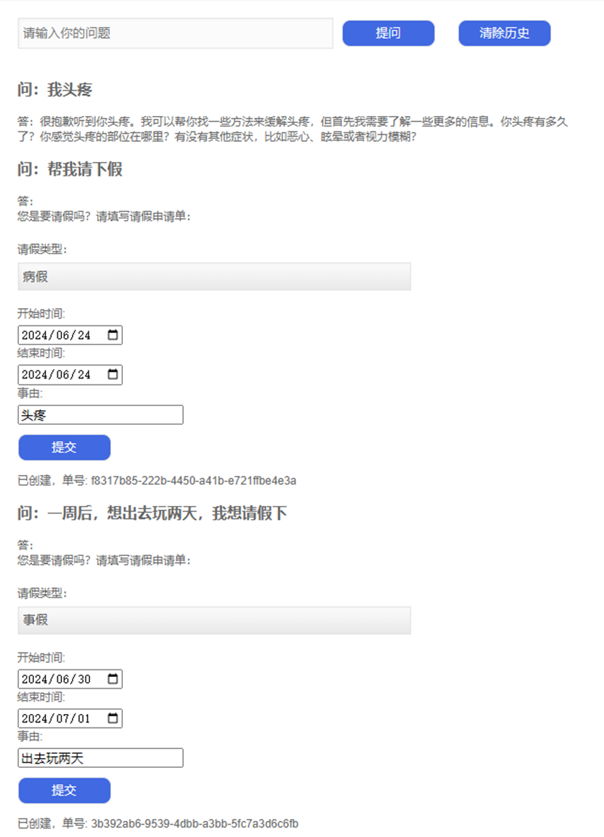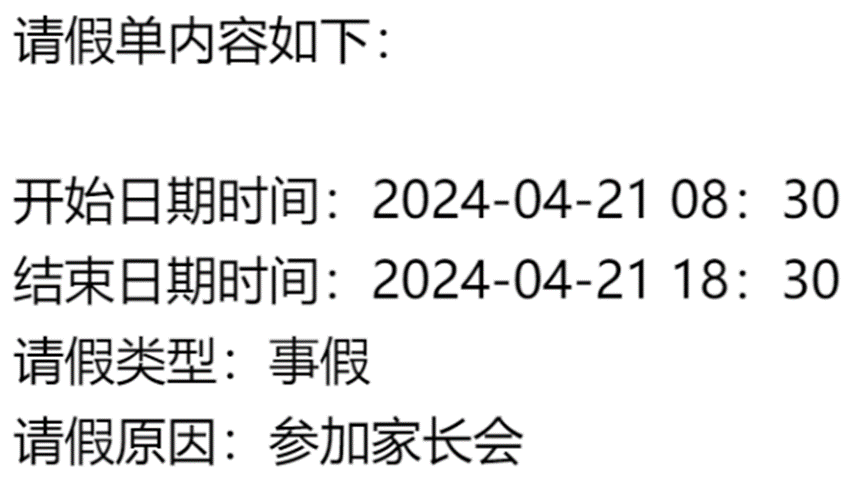 AI可以通过用户的对话内容,识别用户意图,实现表单的自动填充。例如:“一周后,想出去玩两天,我想请假下”,即可创建一个如下的请假单: