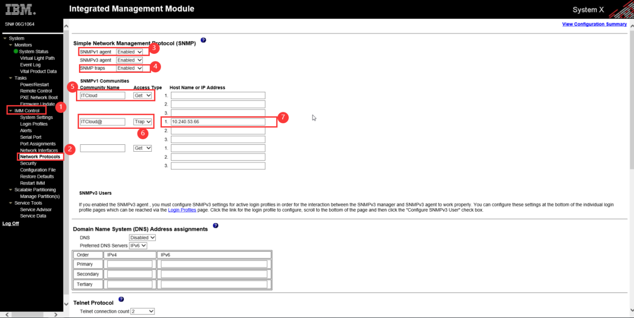 2、配置SNMP和SNMPTrap。路径:IMM Control——Network Protocols,勾选Enable SNMPv1 Agent为Enabled,SNMP traps为Enable.