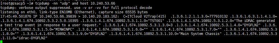 SNMPTrap测试,在配置SNMPTrap之前,在trap接收服务器上使用tcpdump命令监听结果如下: