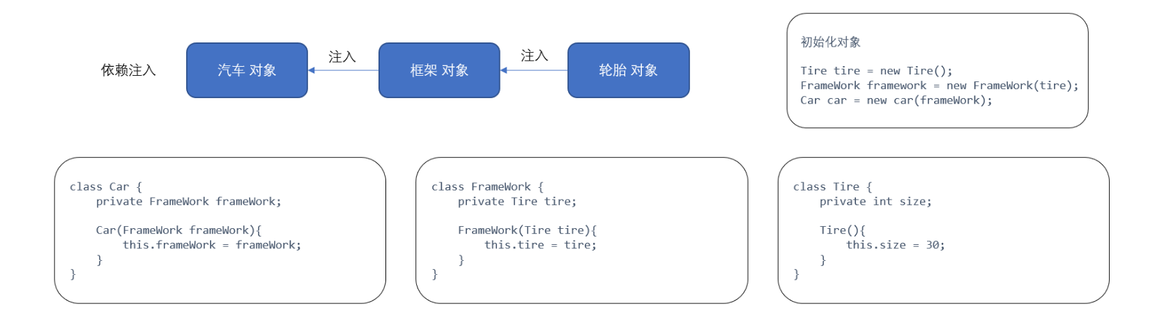 ( Dependency Injection ) 我们用依赖注入的方式来降低耦合度。所谓依赖注入,就是把底层对象作为参数传入上层对象。避免底层类被修改后上层类代码也要随之改动。我们一般通过构造方法或者 setter 方法注入底层对象。