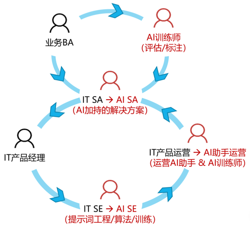 这里大致给个示意(葫芦图),蓝色部分是传统软件开发的几个关键角色,红色部分是我们为了AI大模型应用而改造或新增的角色。