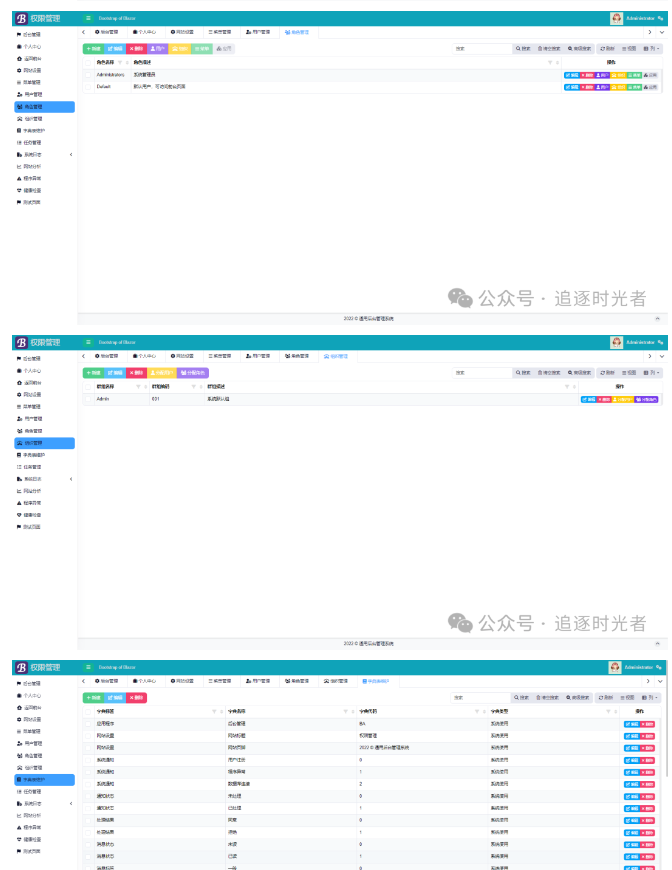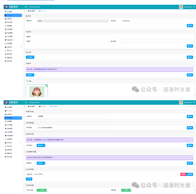 项目主要包含了个人中心、网站设置、菜单管理、用户管理、角色管理、组织管理、字典保护、任务调度管理、系统日志、监控检查等多个功能模块。