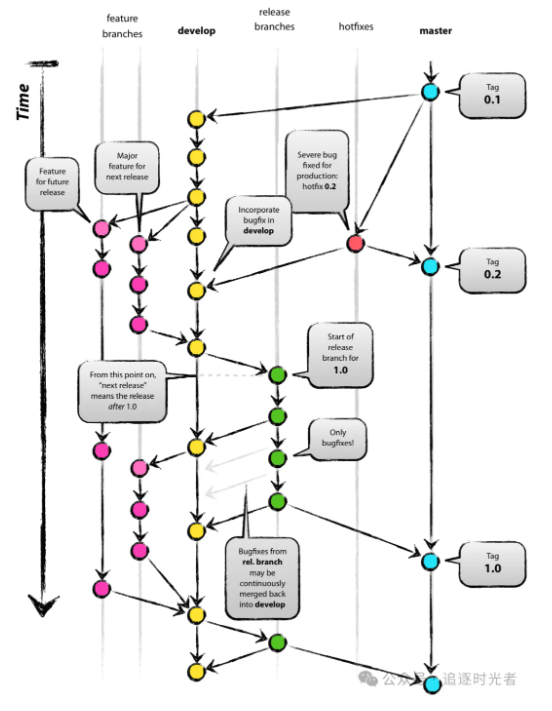 在一些流程完善的公司往往都会有着自己一套比较完善的Git分支管理模型来保障开发和生成环境的代码稳定性,而Git开发、发布、缺陷分离模型是一种流行且适用于大多数团队的Git分支管理模型,它支持master/develop/feature/release/hotfix类型分支。使用这种分支管理模型可以有效地隔离开发、发布和缺陷修复工作,提高代码的质量和稳定性。同时,也可以更好地协作和进行版本管理。如下是一张详细的master/develop/feature/release/hotfix类型分支管理图: