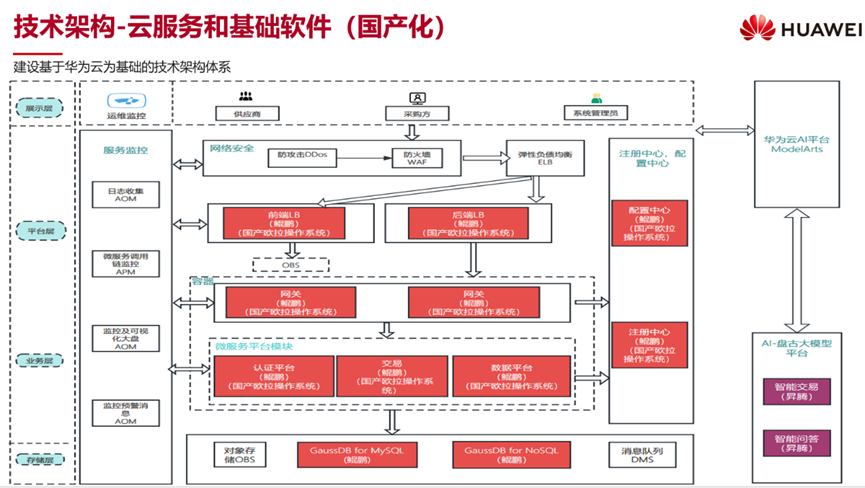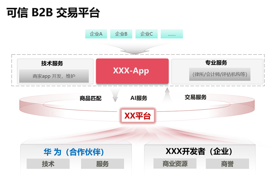 - 开发者(客户)目标是打造一个toB 领域的可信交易体系,提升企业招标,采购业务的效率,降低招标,采购的交易成本,目标是建设一个助力国民经济健康发展的底层平台。平台的高定位,决定了其必须,采用国产化技术底座进行搭建,华为的6大生态(鲲鹏、昇腾、高斯等)匹配了开发者的战略述求,专家服务帮助开发者完成技术架构设计。