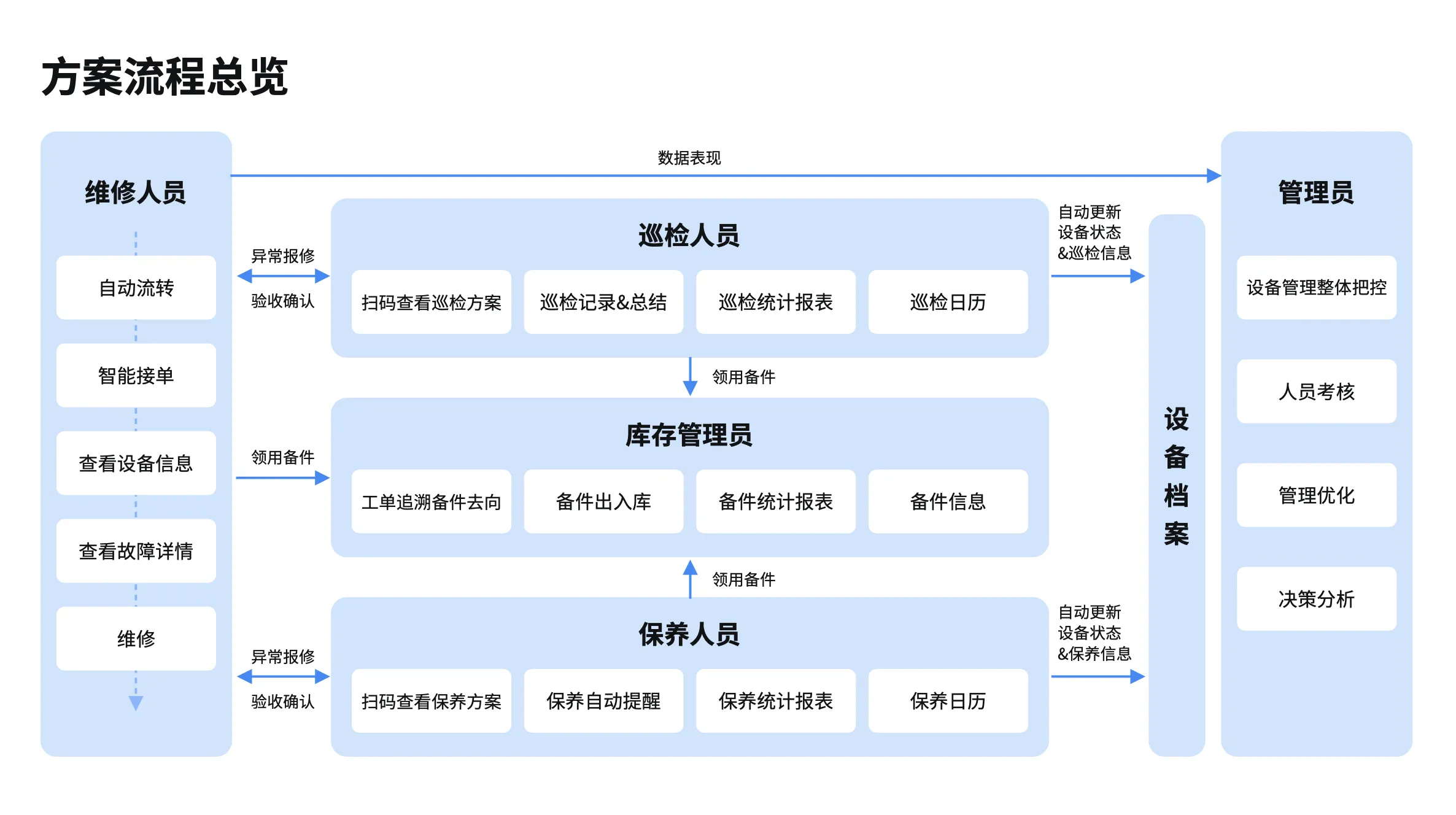 - 维修效率低:发现故障后,报修流程进度慢,维修不及时,耽误设备投入生产。
