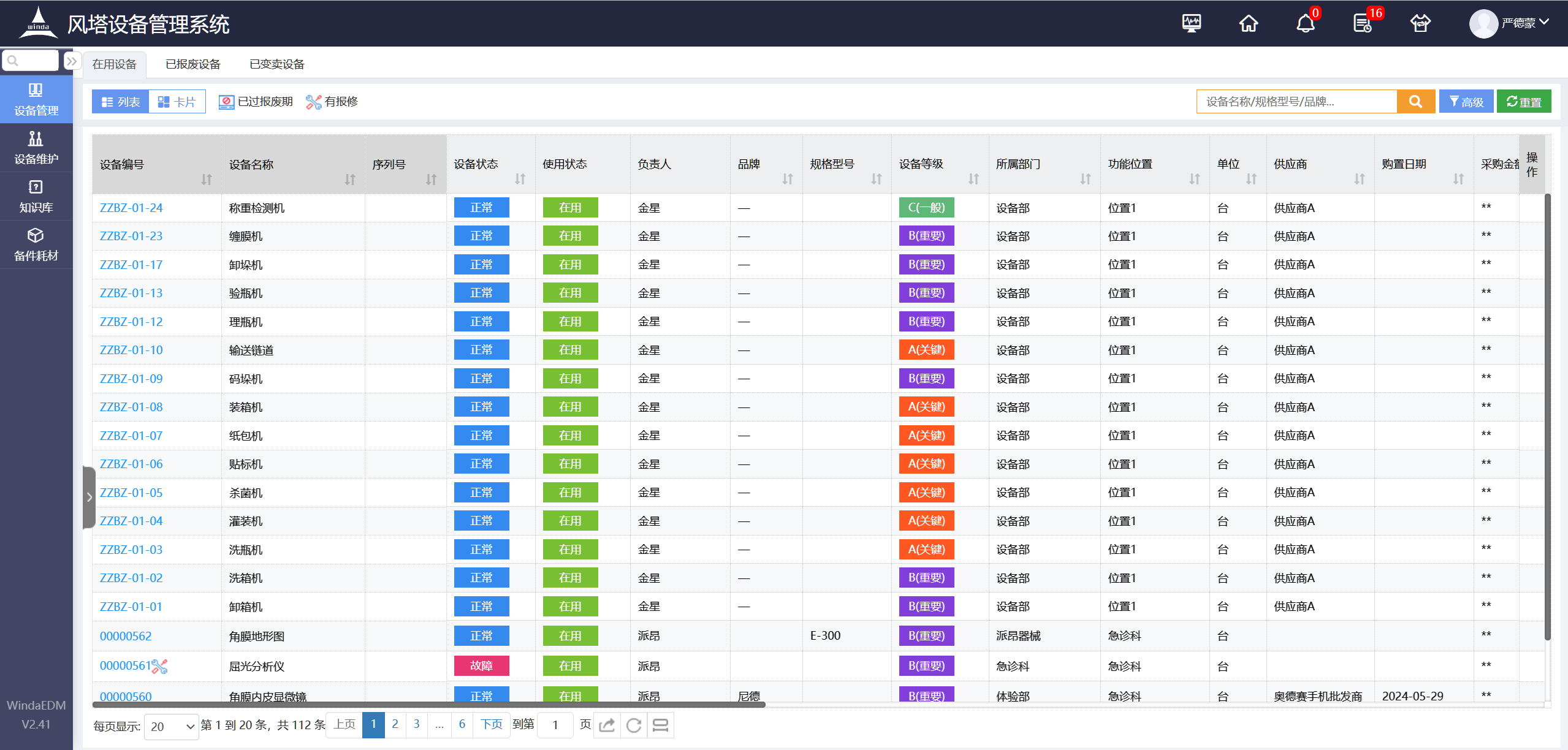 风塔资产设备管理系统是一款通用的设备管理软件,适用于各类工厂、企事业、机关、学校、医院等单位。从设备采购到维保再到报废的全生命周期为主线,预防性维护为中心,兼顾设备档案、备品备件的管理。
