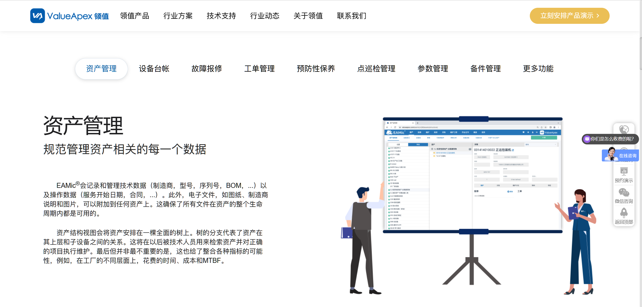 领值是一家专门的设备管理系统(EAMICMMS)独立软件开发商,通过EAMic设备管理软件可完成日常设备管理工作,降低设备维修保养成本,为设备管理者提供一站式服务。
