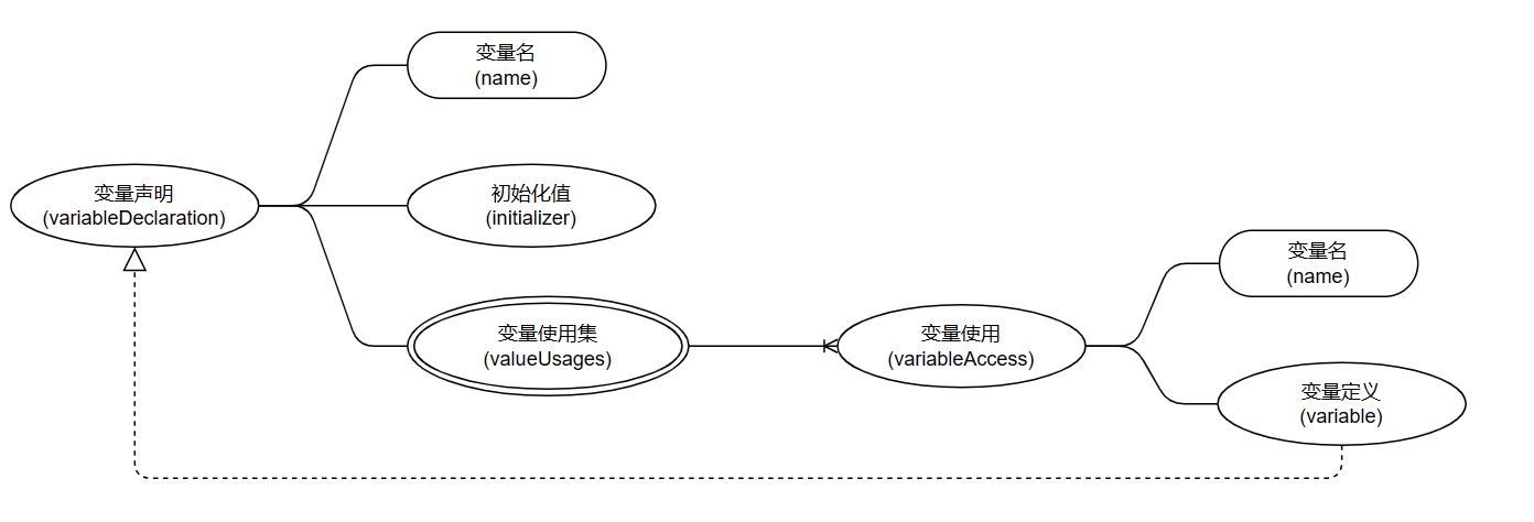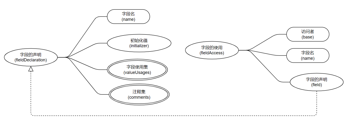 | valueUsages | 字段使用集 | valueAccess类节点、functionCall节点等 | private int aes_key = 3; public void test() { this.aes_key = 10; } |