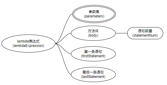| parameters | 参数 | paramDeclaration节点 | list.forEach(integer -> { if (integer == 1) { System.out.println(“单数”); } }); |