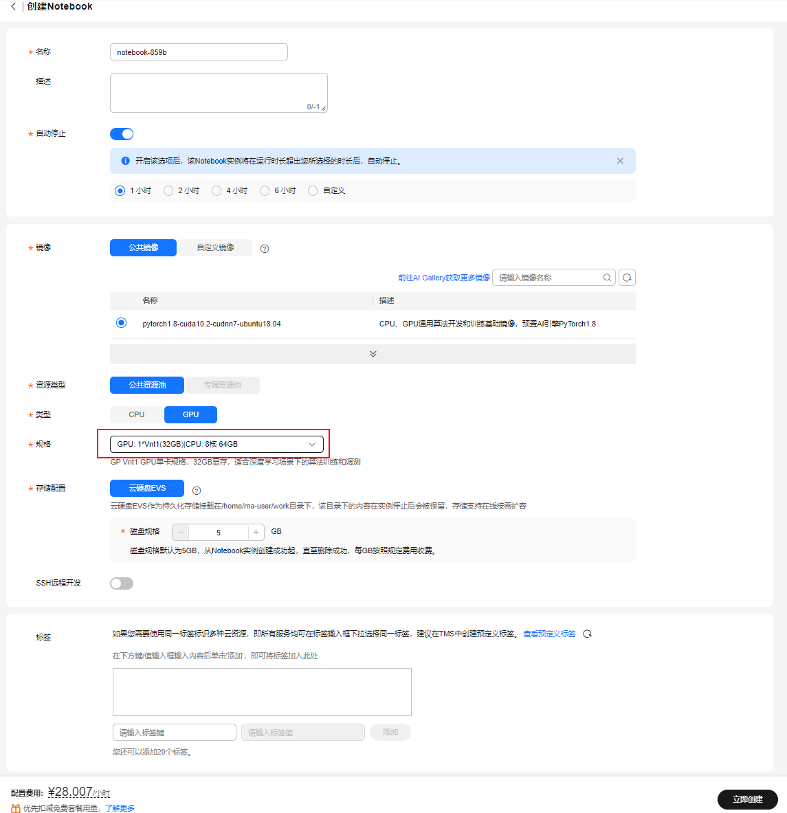 点击“开发环境”-“notebook”,“创建”: