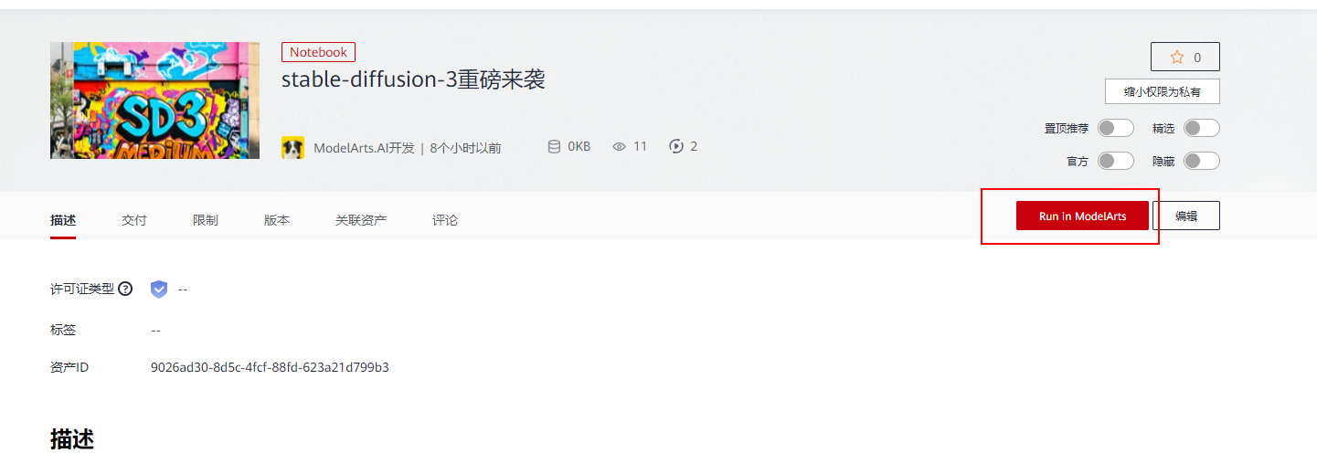 以上步骤是从ModelArts上自己创建notebook,也可以直接点击案例进入体验--stable-diffusion-3重磅来袭。