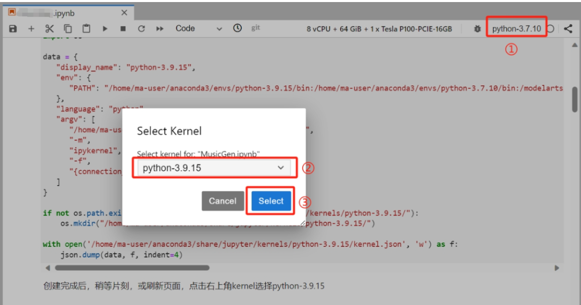 创建完成后,稍等片刻,或刷新页面,点击右上角kernel选择python-3.9.15