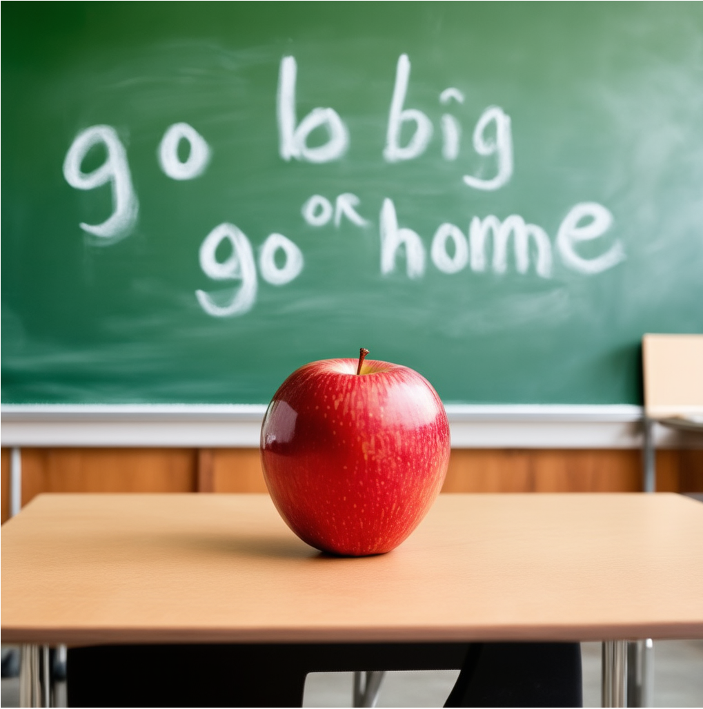 Prompt: cinematic photo of a red apple on a table in a classroom, on the blackboard are the words "go big or go home" written in chalk