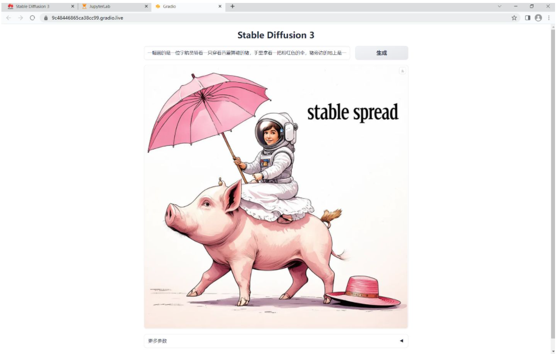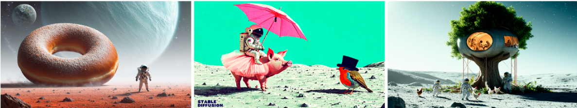 提示:一幅画的是一位宇航员骑着一只穿着芭蕾舞裙的猪,手里拿着一把粉红色的伞,猪旁边的地上是一只戴着大礼帽的知更鸟,角落里写着“稳定扩散”的字样。