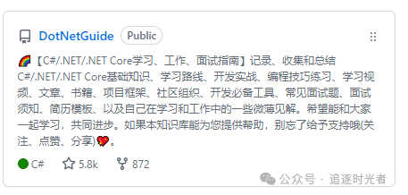 经常在DotNetGuide技术社区交流群里看到有小伙伴问:有什么好用的.NET定时任务调度框架推荐的?有什么好的WPF/WinForm/Blazor图表库推荐的?.NET好用的后台管理、权限工作流框架有推荐的吗?大家平时都是怎么找C#/.NET/.NET Core相关项目和框架的?本文将告诉你找.NET相关的项目和框架可以优先看DotNetGuide的C#/.NET/.NET Core优秀项目和框架精选专栏,里面收录了大量的.NET相关的优秀项目和框架,当然假如你有更好的项目和框架推荐的欢迎PR投稿(让优秀的项目和框架不被埋没)。