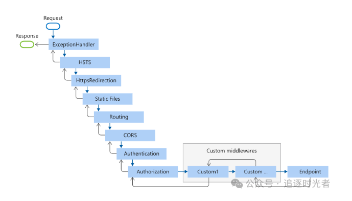 开发者通过在请求处理管道中添加不同的中间件(Middleware)组件,可以实现应用程序的认证和授权、日志记录、异常处理、静态文件处理、路由和端点映射、CORS(跨域资源共享)、会话管理、请求压缩、国际化和本地化、缓存等各种功能。