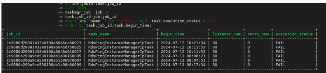 2、登录rms数据库查看失败task名称、jobid、执行任务的controller容器,操作方法见第一章节:https://bbs.huaweicloud.cn/blogs/427974