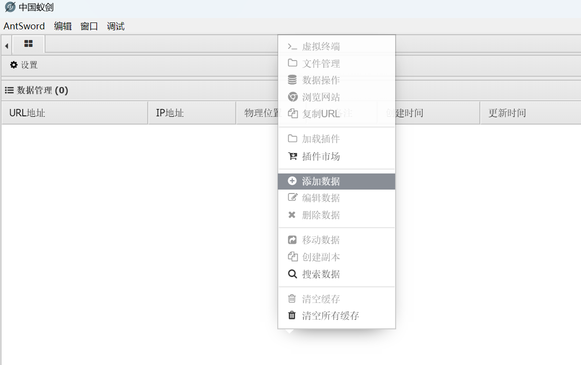 1. 启动AntSword应用后,在界面的任意空白区域点击鼠标右键,这时会出现一个菜单。在弹出的菜单中,选择「添加数据」选项。