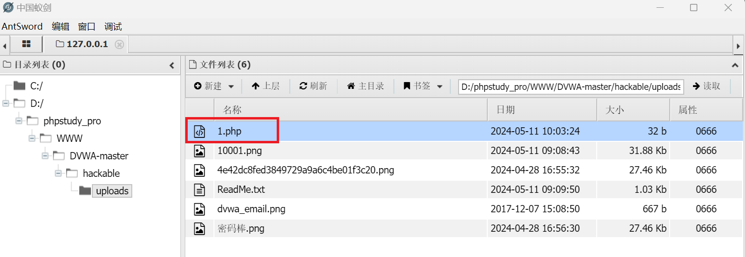 2、Low级别没有对上传的文件进行任何限制,我们可以直接上传一句话木马,然后使用中国蚁剑连接。