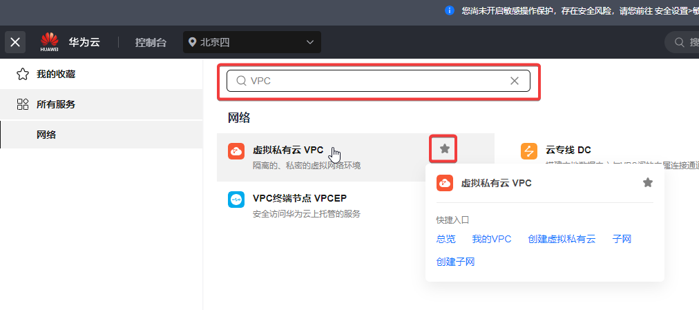 如果你还没有将虚拟私有云收藏到“我的资源中”,则点击左上角的折叠菜单开关,然后在输入框中输入“VPC”。点亮“虚拟私有云 VPC”词条右侧的“★”将其添加到华为云控制台首页“我的资源”区,如图。