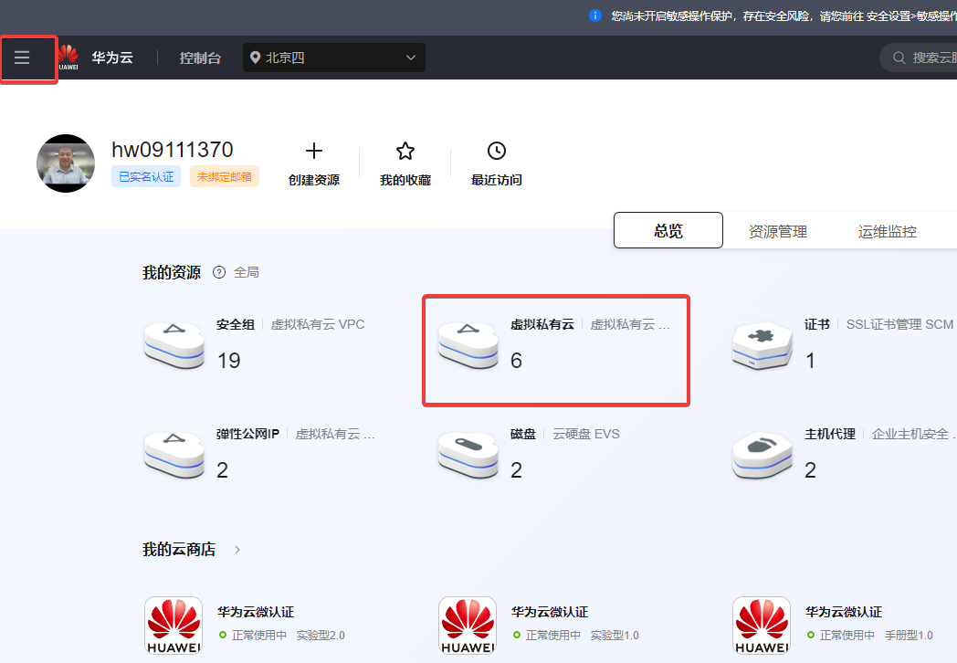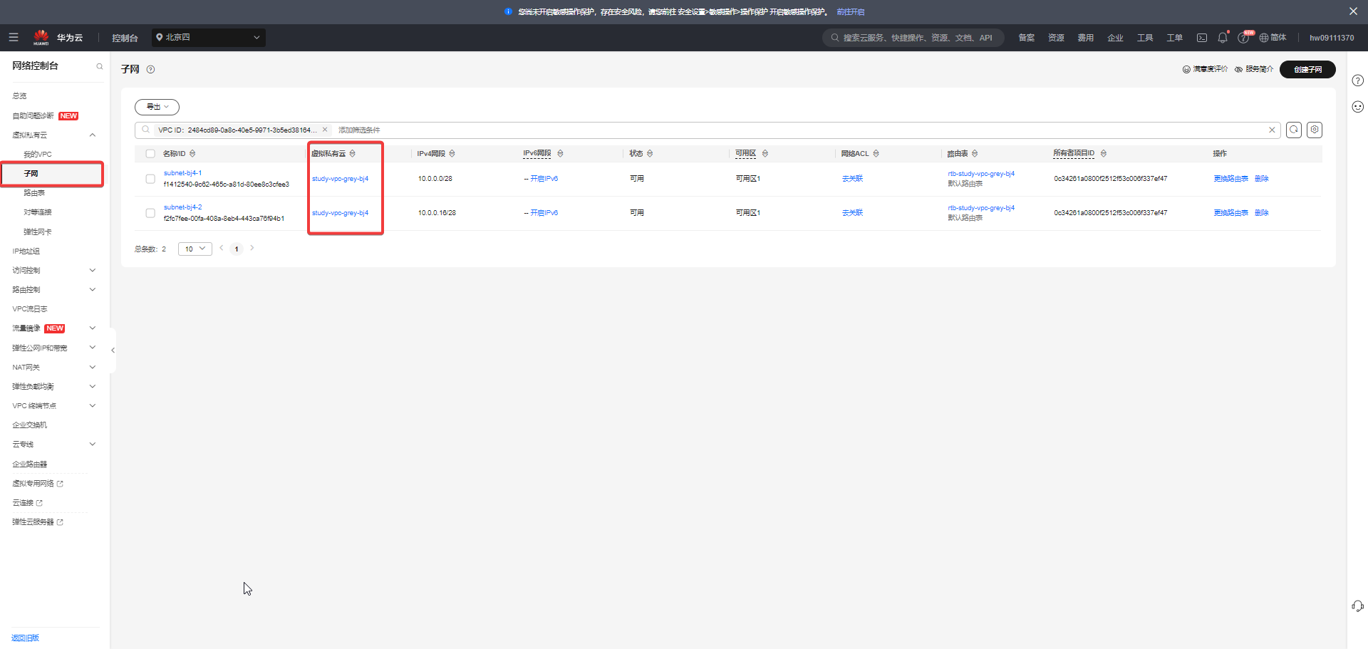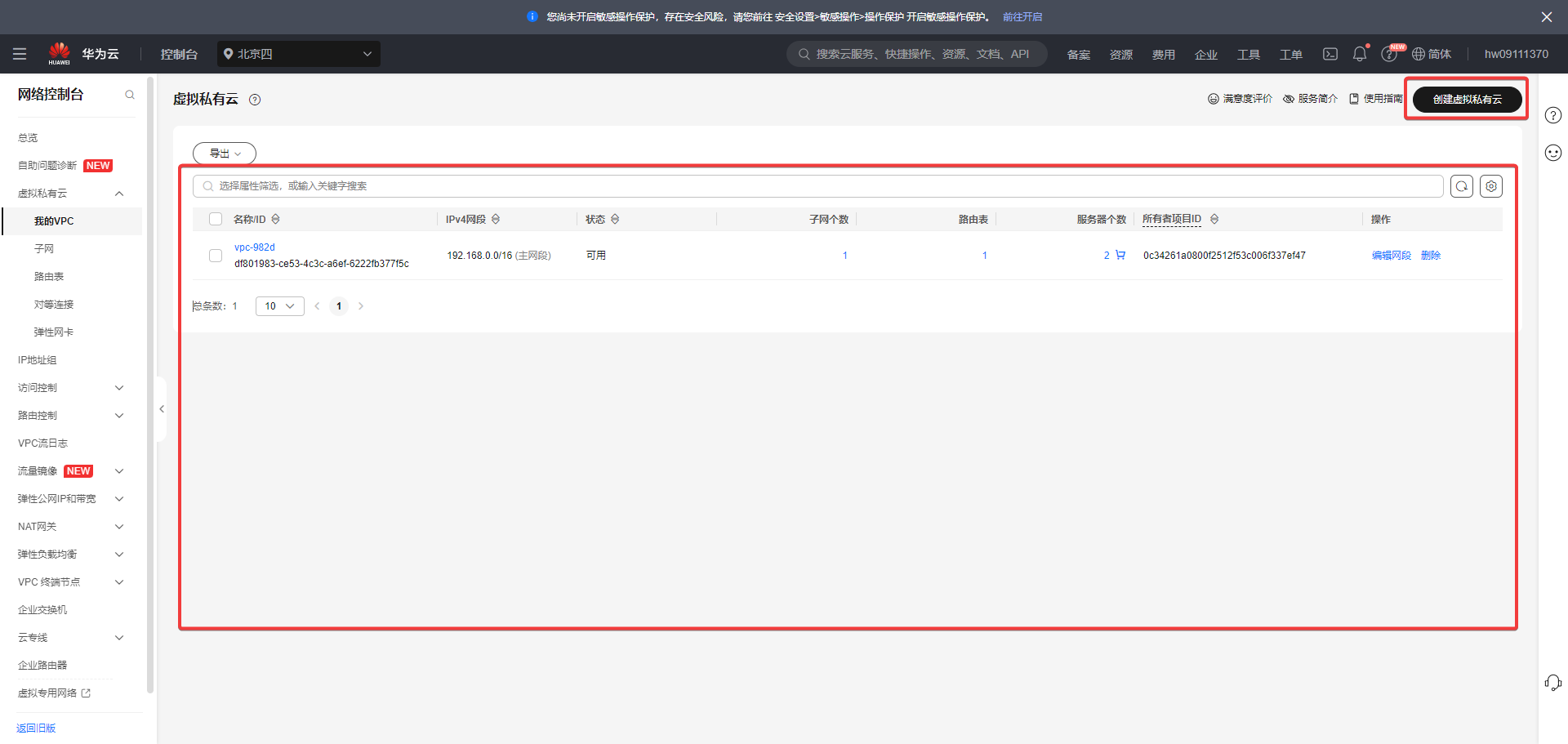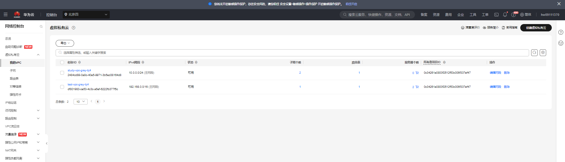 登录控制台,选择区域(如“北京四”)。打开“虚拟私有云”,如图所示。