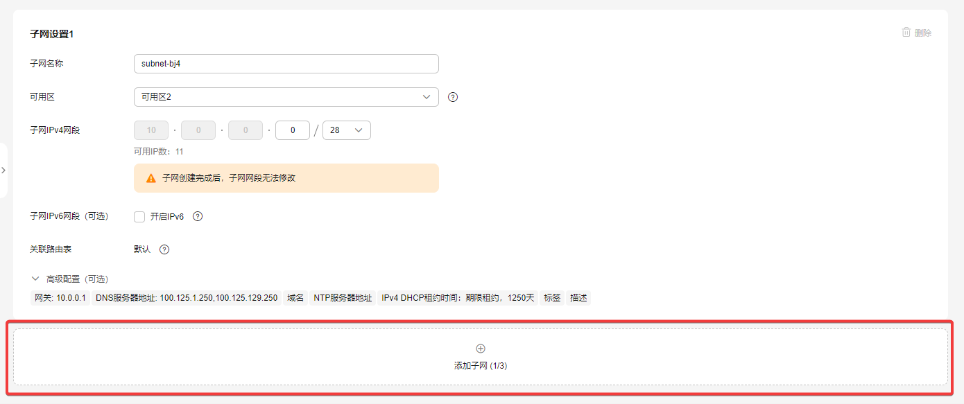 一个VPC内可以有多个子网,但是至少有一个子网,因此默认情况下用户需要完成“子网设置1”的填写。如果你想此时直接创建多个子网,则可以点击“创建子网”区域创建更多子网。如图所示: