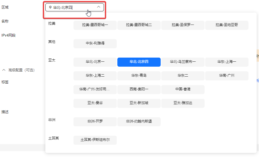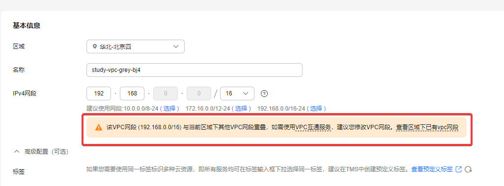 基本信息主要包含区域、名称、IPv4网段三个部分。可选填写高级设置中的标签和描述。