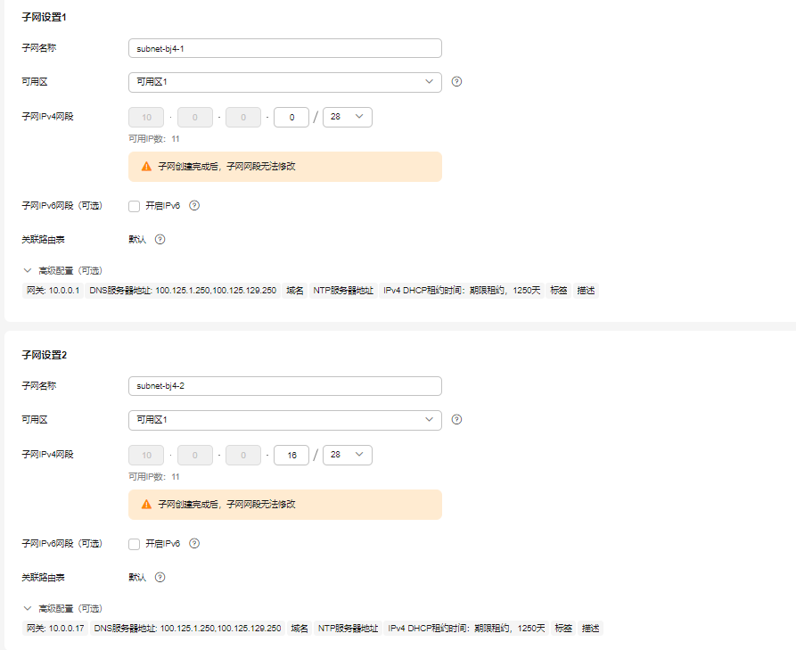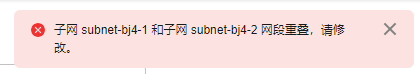 这里的任何一个子网都设置的子网IPv4网段,都属于10.0.0.0/24限定的范围,因此单个子网最大的网段即10.0.0.0/24。创建多个子网时,各个子网的网段应该确保不重叠,否则无法完成创建: