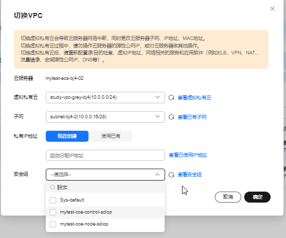 这个默认安全组有时也会显示为“Sys-default”,应该是因为华为云曾今使用该名称,写的死数据,导致部分地方使用“default”、部分地方使用“Sys-default”作为默认安全组的名称。比如为切换ECS的VPC时,就显示为“Sys-default”: