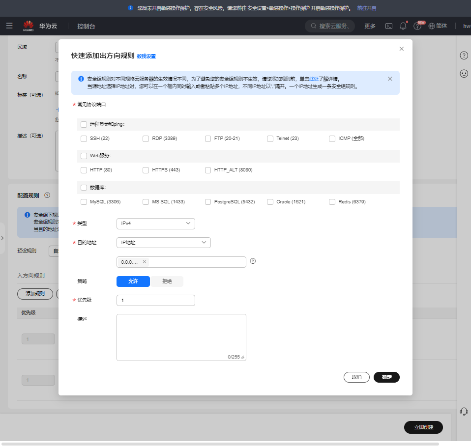 但是如果你确定是具体的某一台主机,比如IP为192.168.10.9主机上部署了MySQL,并监听3306端口,则目的地址应该写192.168.10.9/32。参数设置过后,点击“立即创建”即可添加该自定义的安全组规则: