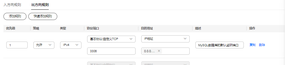 则需要放通3306端口。这里需要说明的是“目的地址”。