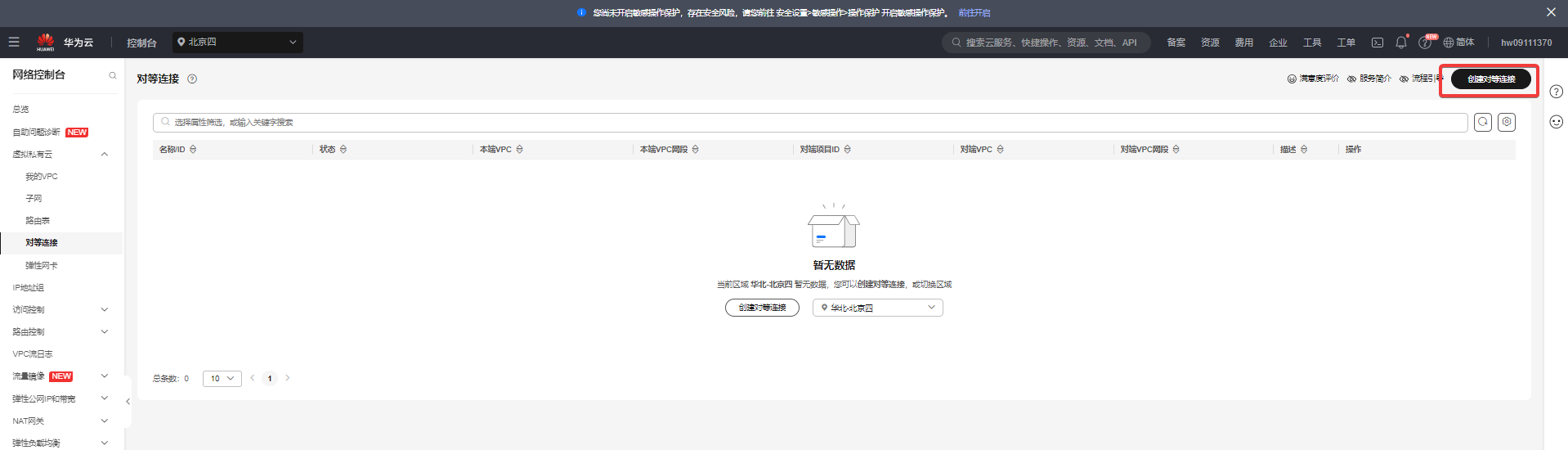 还是在“网络控制台”。从左侧的“虚拟私有云”下找到并打开“对等连接”标签页。点击页面的右上角“创建对等连接”: