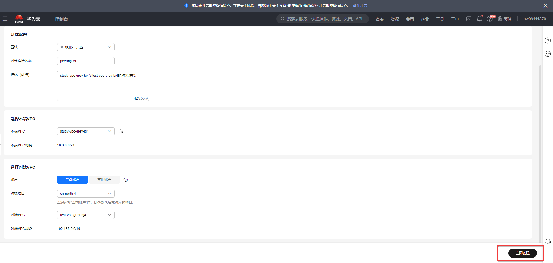 现在,我们为同在当前账户下的两个VPC(简称为VPCA和VPCB),创建一个从VPCA(study-vpc-grey-bj4)到VPCB(test-vpc-grey-bj4)的对等连接,编写VPC信息完成后点击“立即创建”: