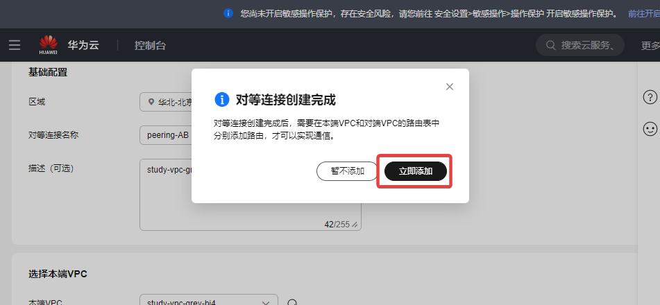 VPC对等连接创建完成后,还需要在本端VPC和对端VPC的路由表中分别添加路由,才可以实现通信,因此弹出此对话框: