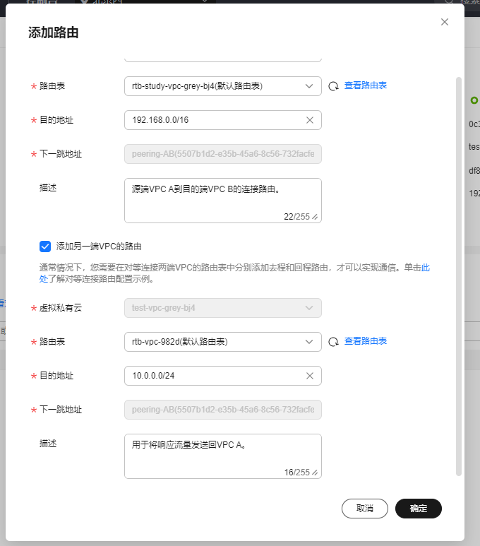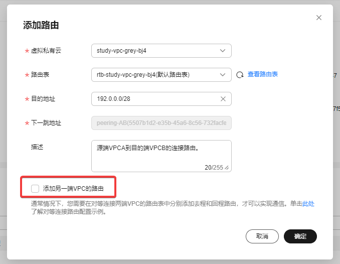 勾选“添加另一端VPC路由”,即可在此弹窗添加从VPCB(test-vpc-grey-bj4)的回程路由: