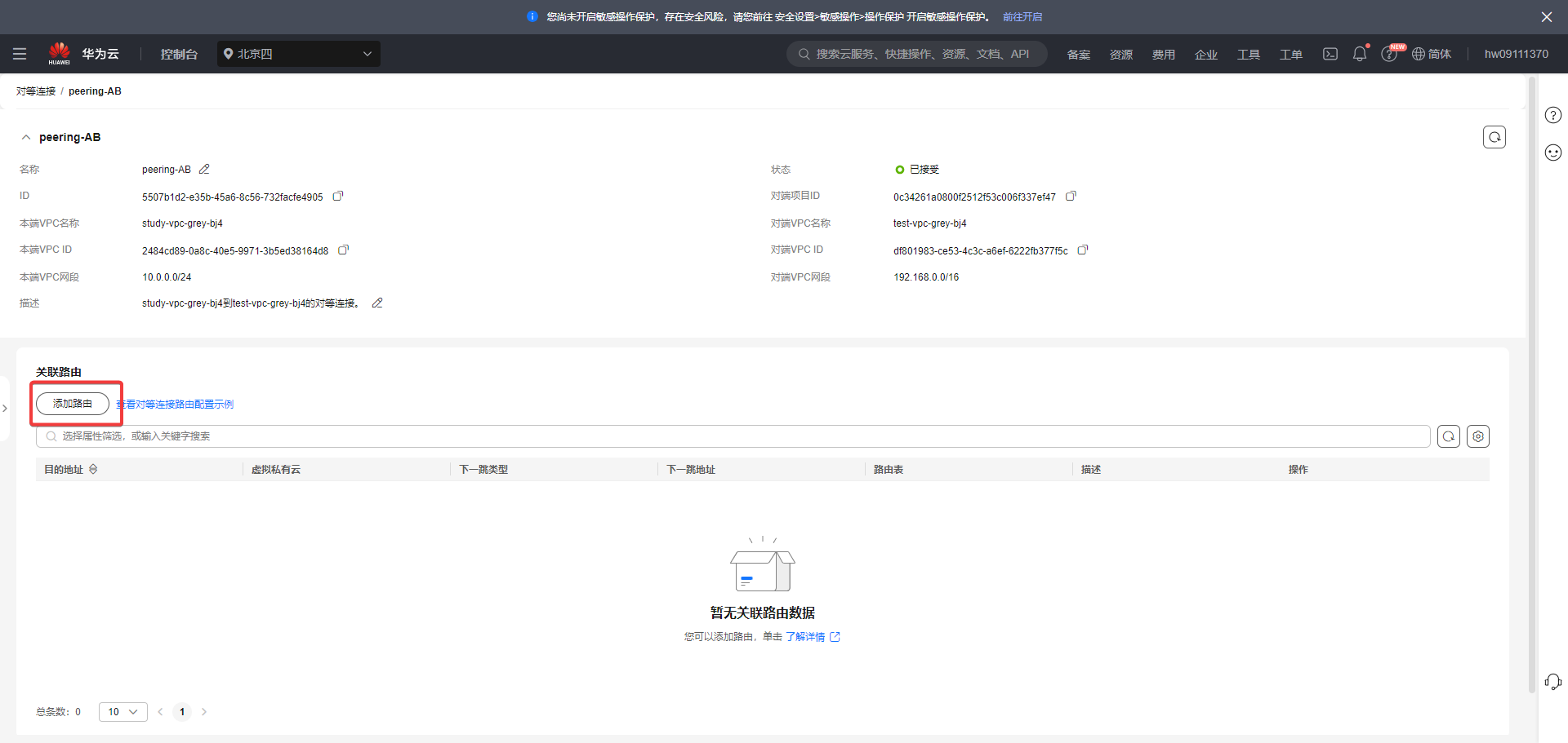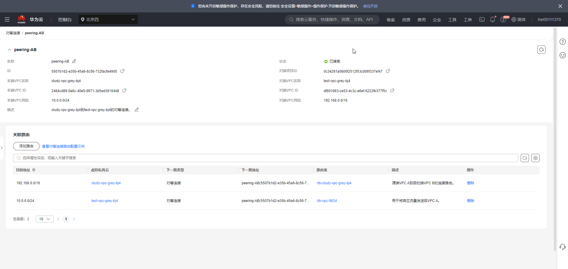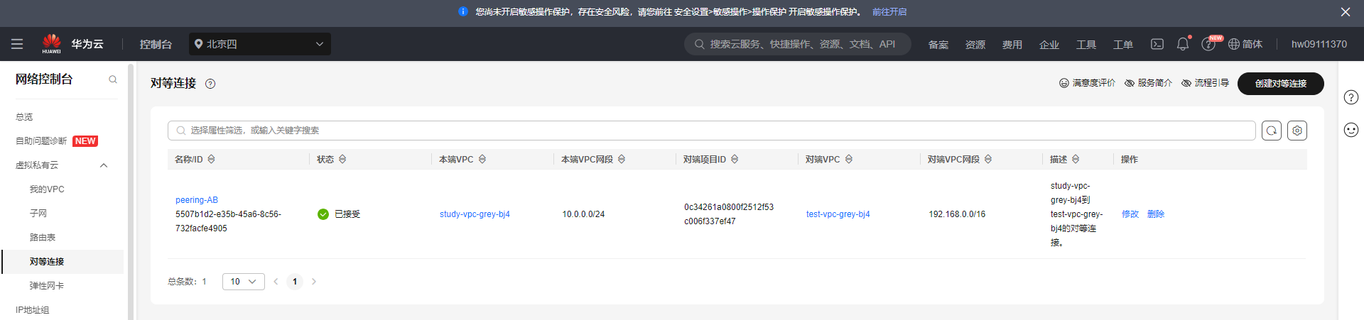 比如,先以本端虚拟私有云为VPC A( study-vpc-grey-bj4),到对端VPC B( test-vpc-grey-bj4)