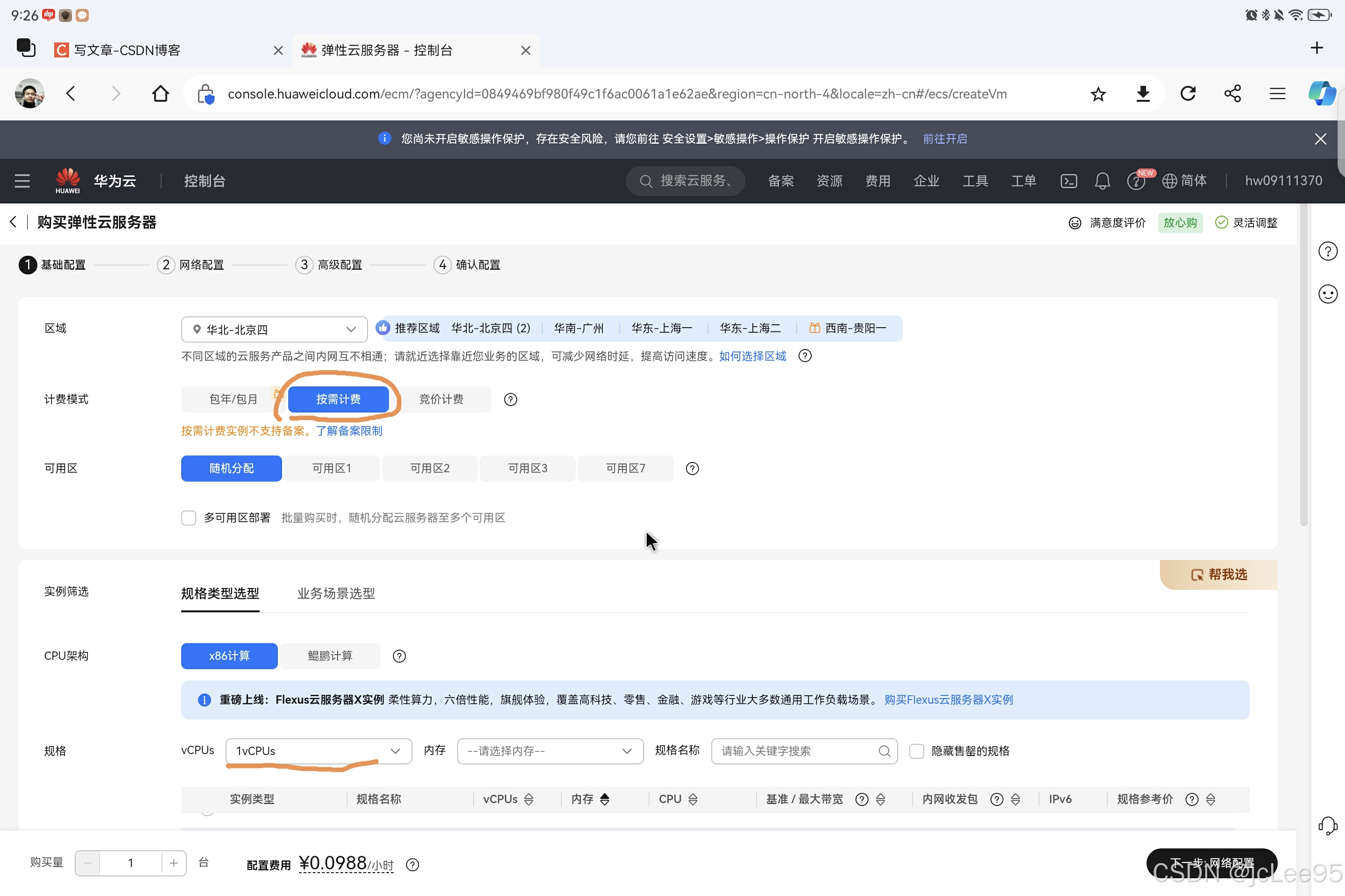 犹豫仅仅是实验。这里一定要选择按需计费,一边我们在实验结束后方便对实例进行删除,以最大程度节省我们的经费: