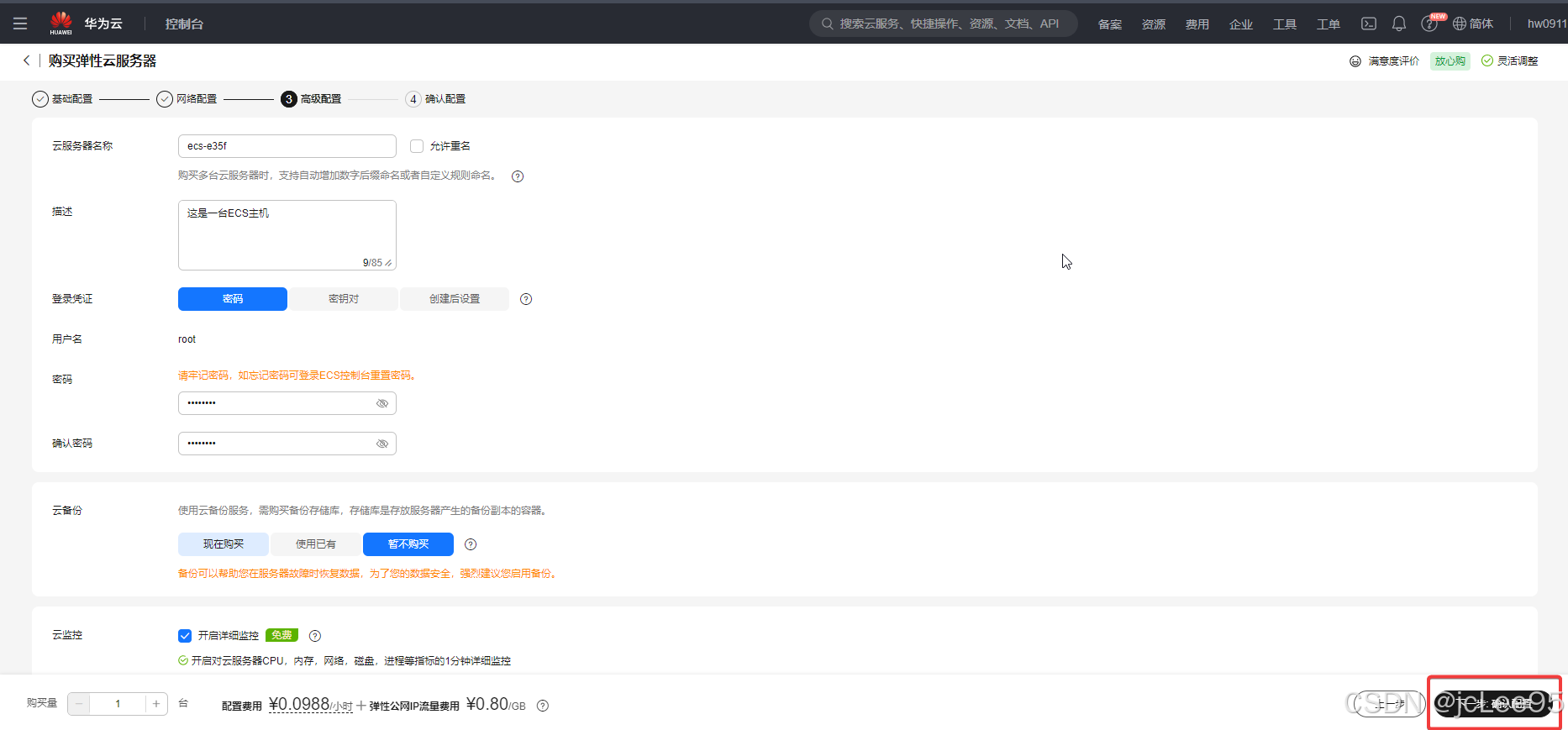 在高级配置页面中,设置ECS实例的名称、描述,以及密码等信息,完成后点击:“下一步,确认配置”: