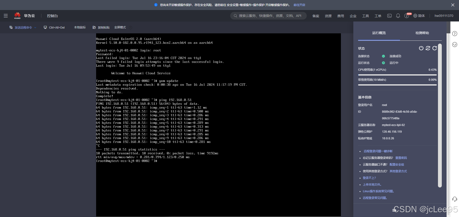 输入密码后完成登录,并在其中Ping位于对等连接的另一个VPC中的实例私网IP(我这里是192.168.0.51)