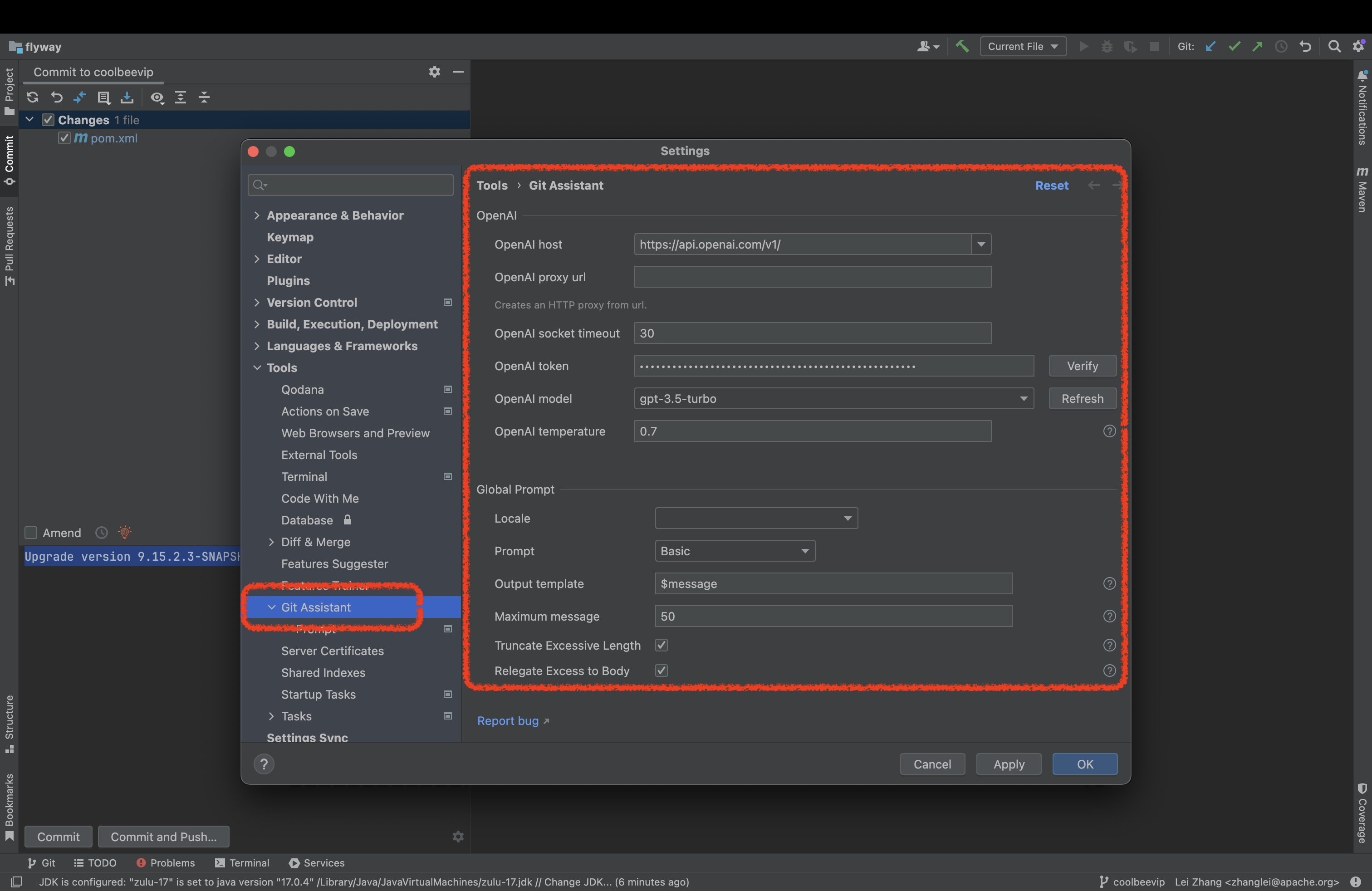 使用 Git Assistant IntelliJ 插件中的 AI 功能来生成提交信息